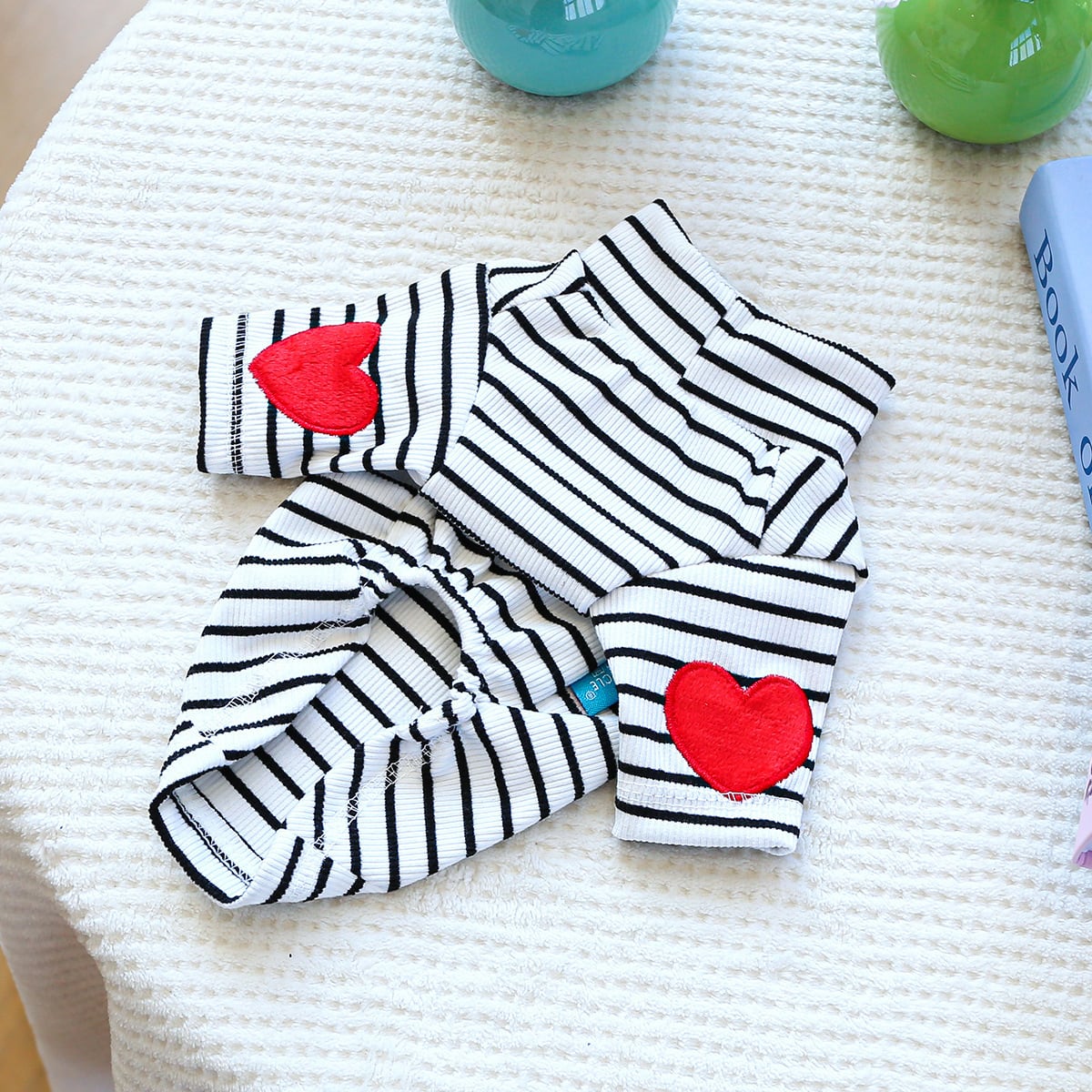 モノトーンのボーダーにハートの差し色が映え、お散歩やお出かけコーデの主役になります。