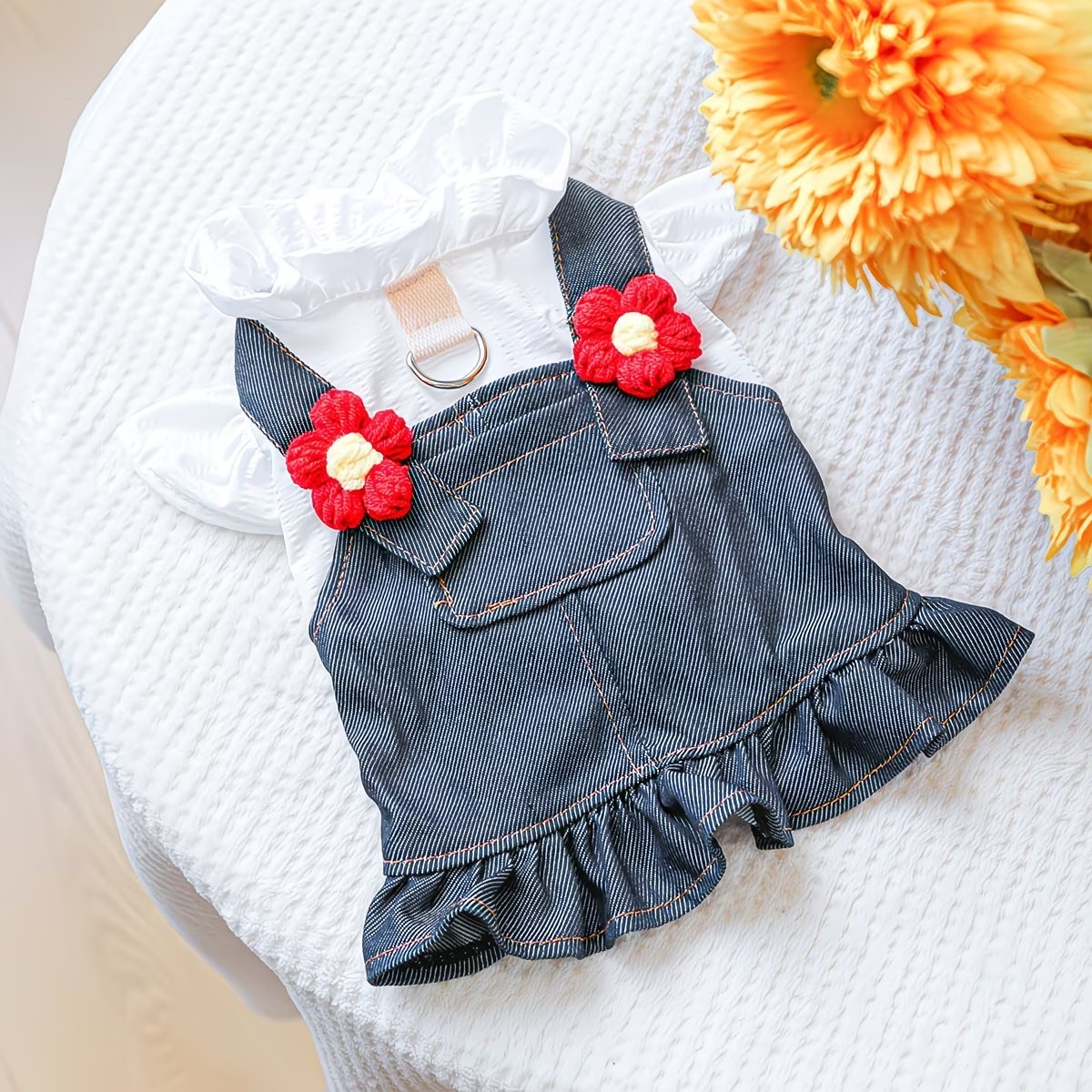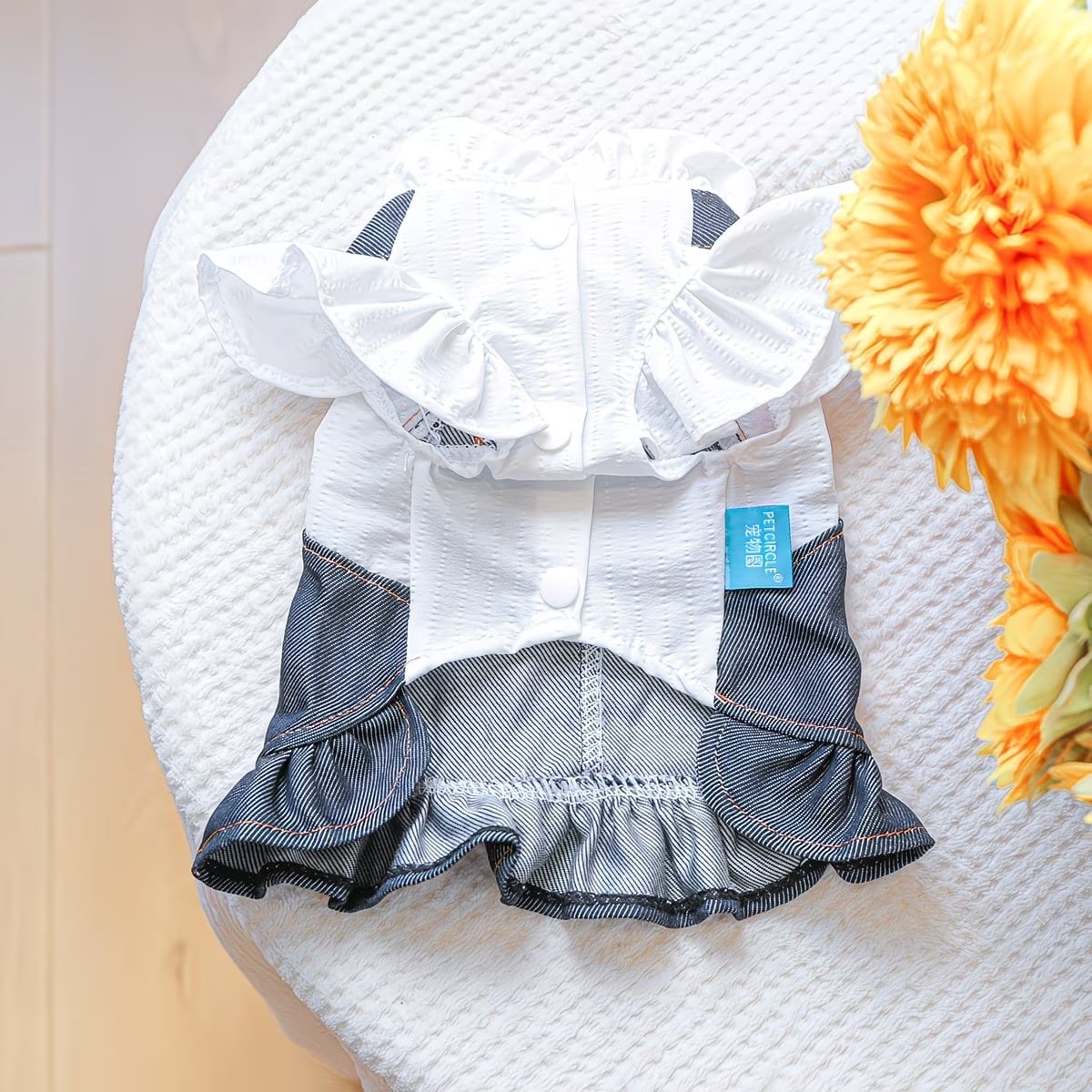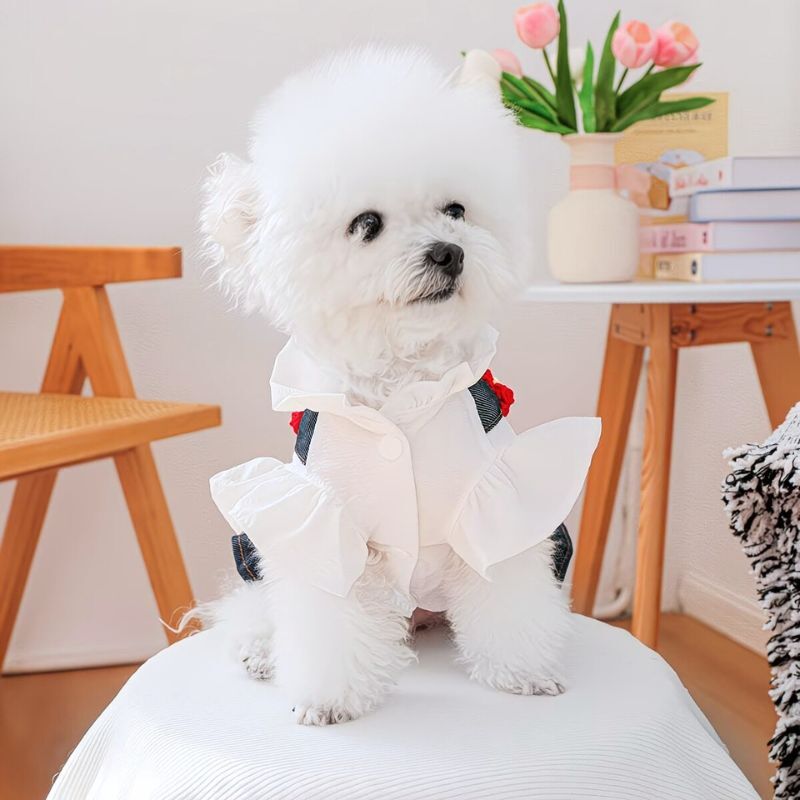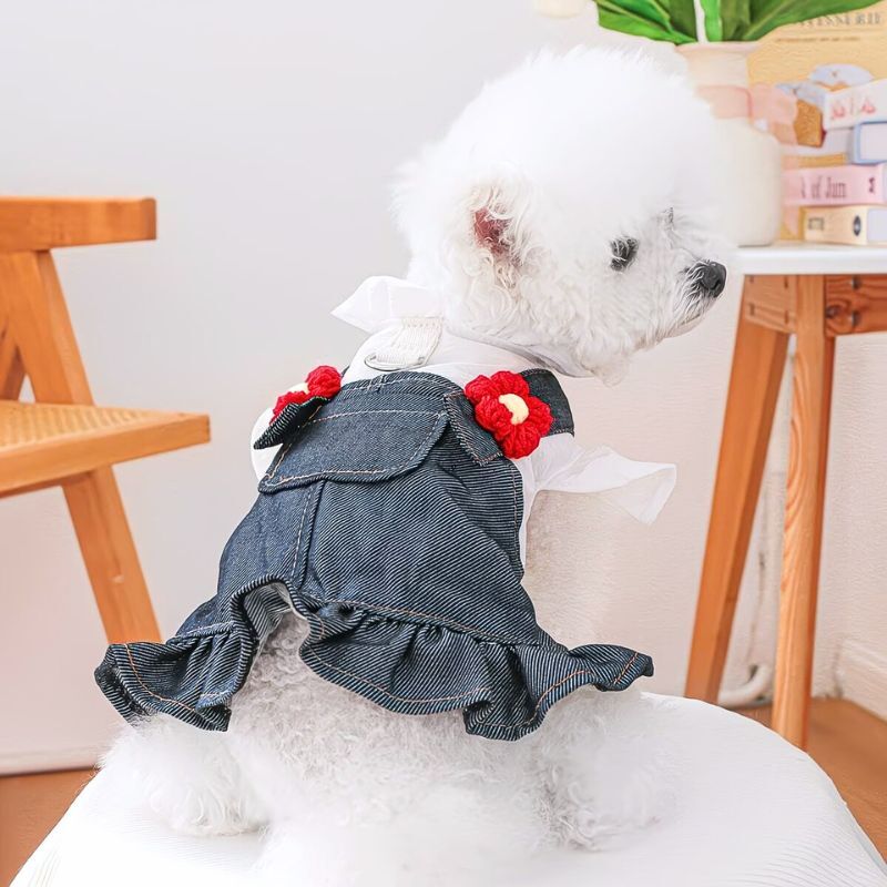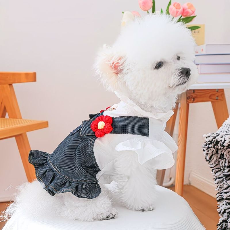 【予約】フラワーモチーフ付き デニムフリルワンピース 犬服 (小型犬用 / カジュアル / オールシーズン)