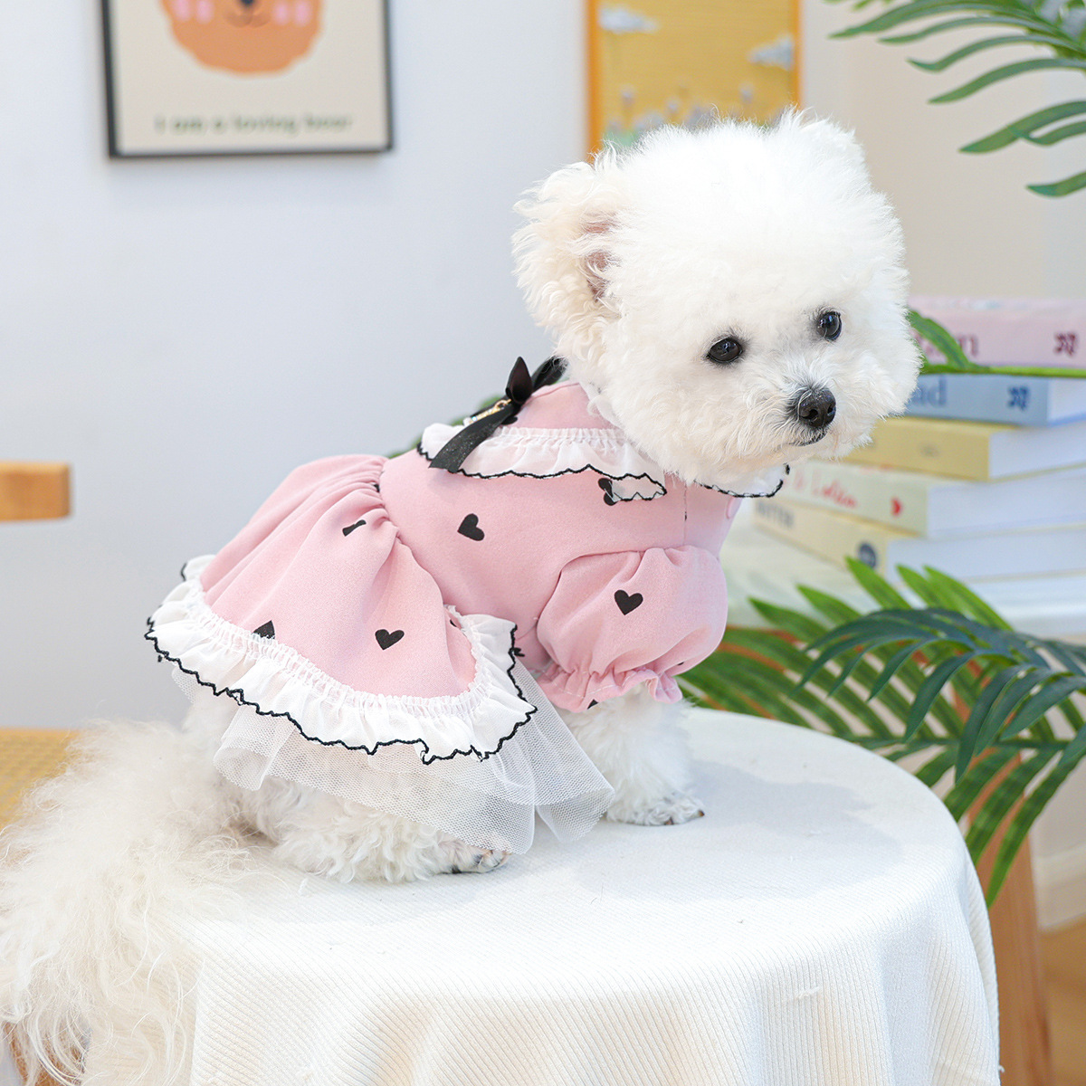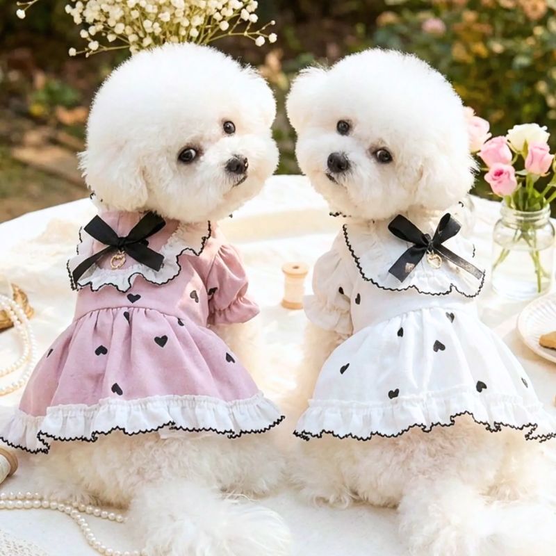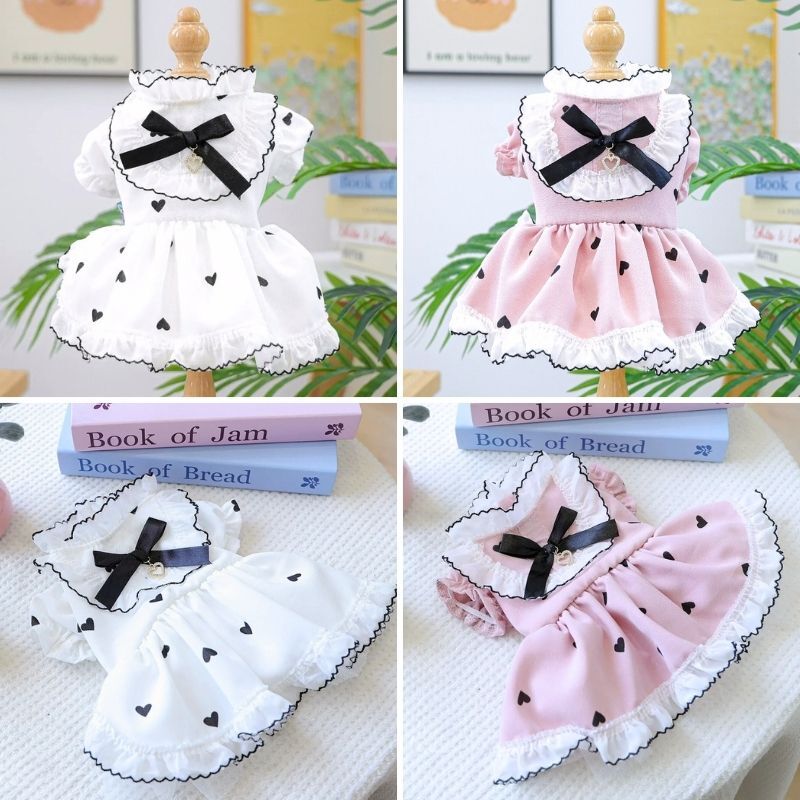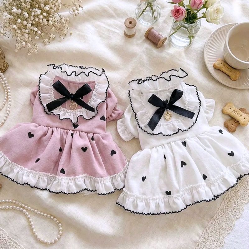 【予約】ハート柄フリル襟ワンピース|リボン付きお嬢様ドレス・小型犬用ガーリーワンピ