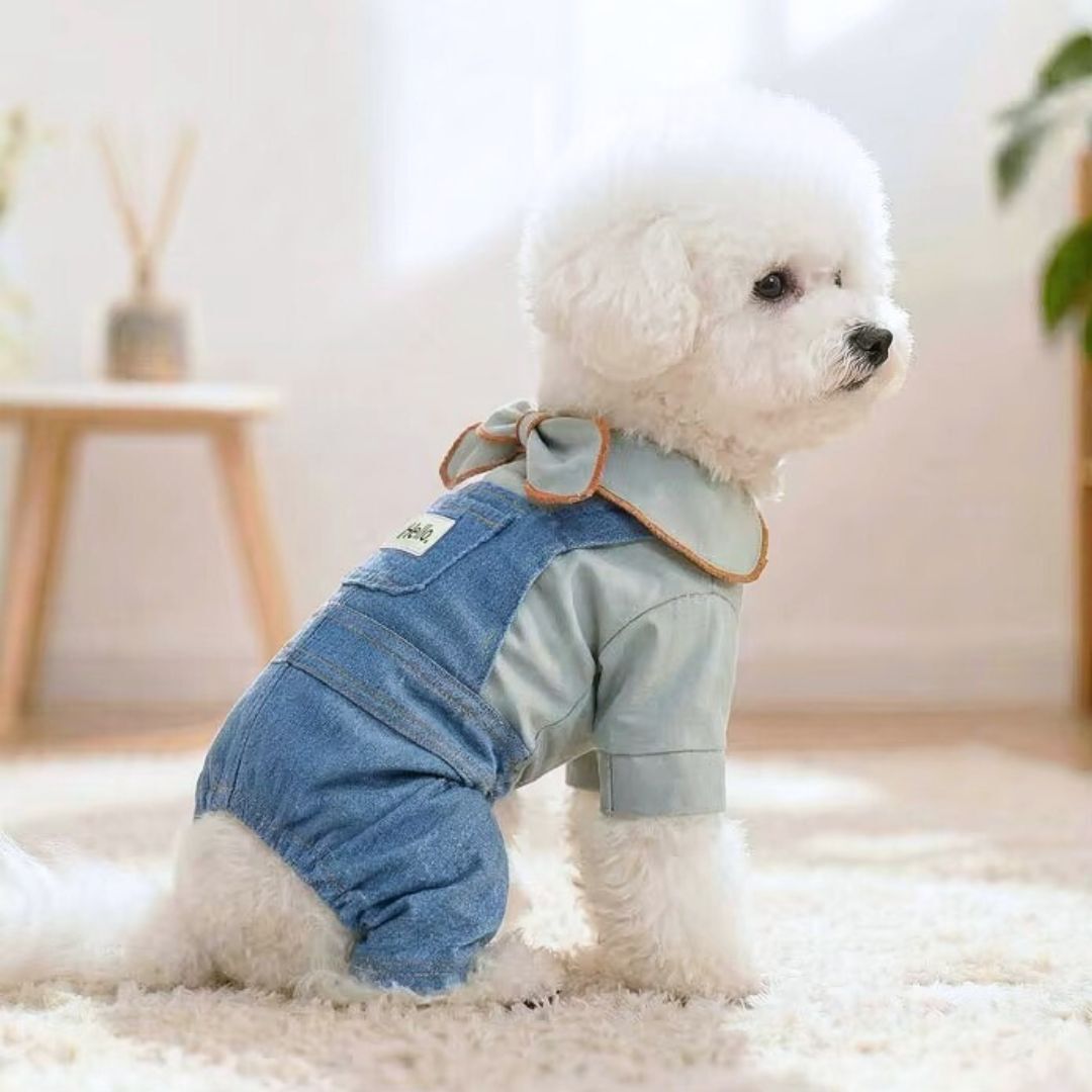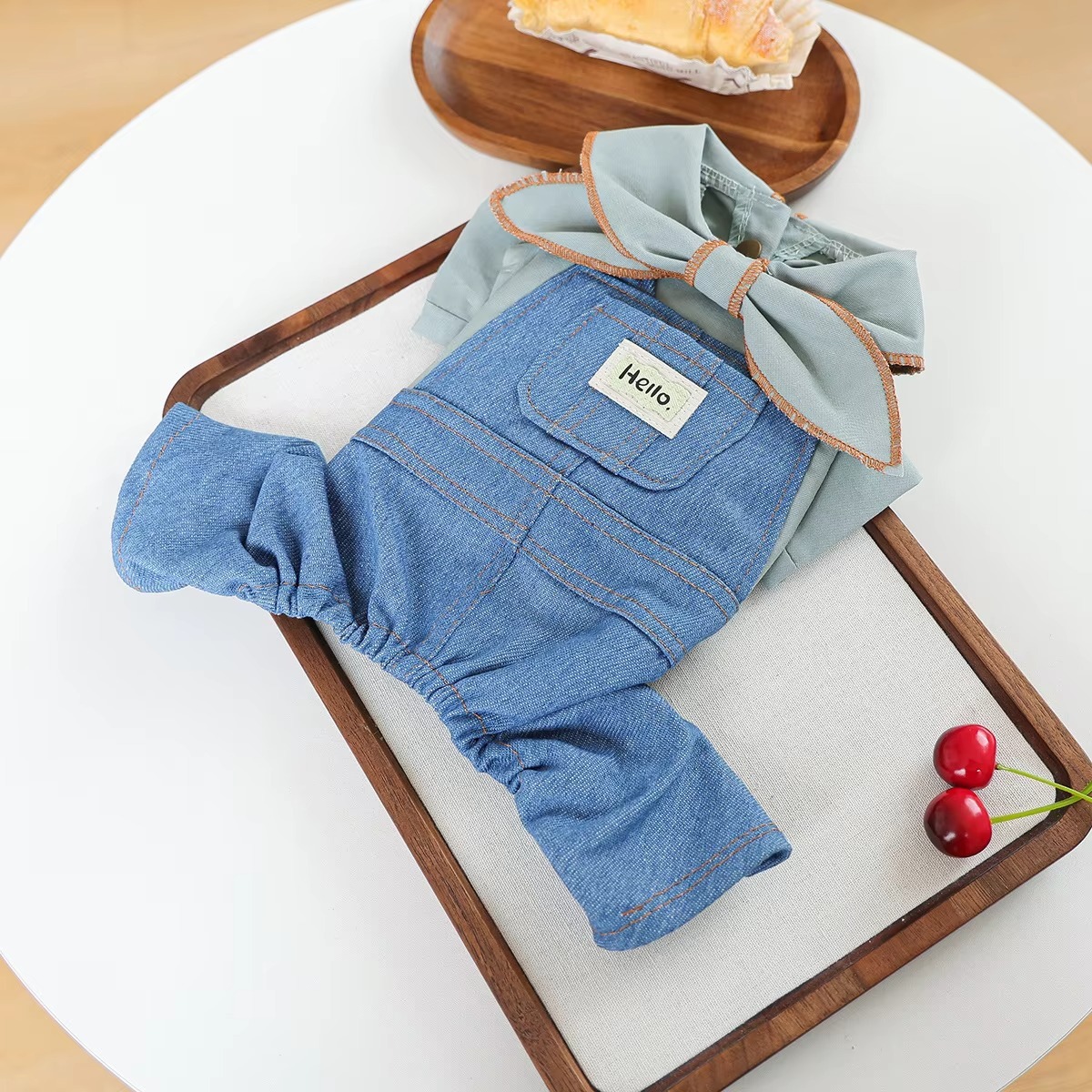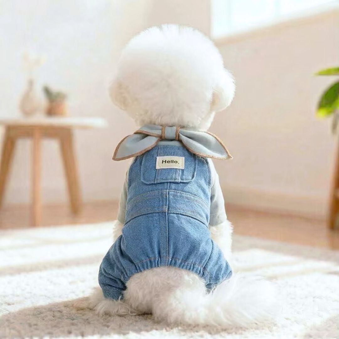 【予約】リボン付きデニムオールインワン 犬服 春夏 小型犬 おしゃれ カジュアル かわいい ペットウェア