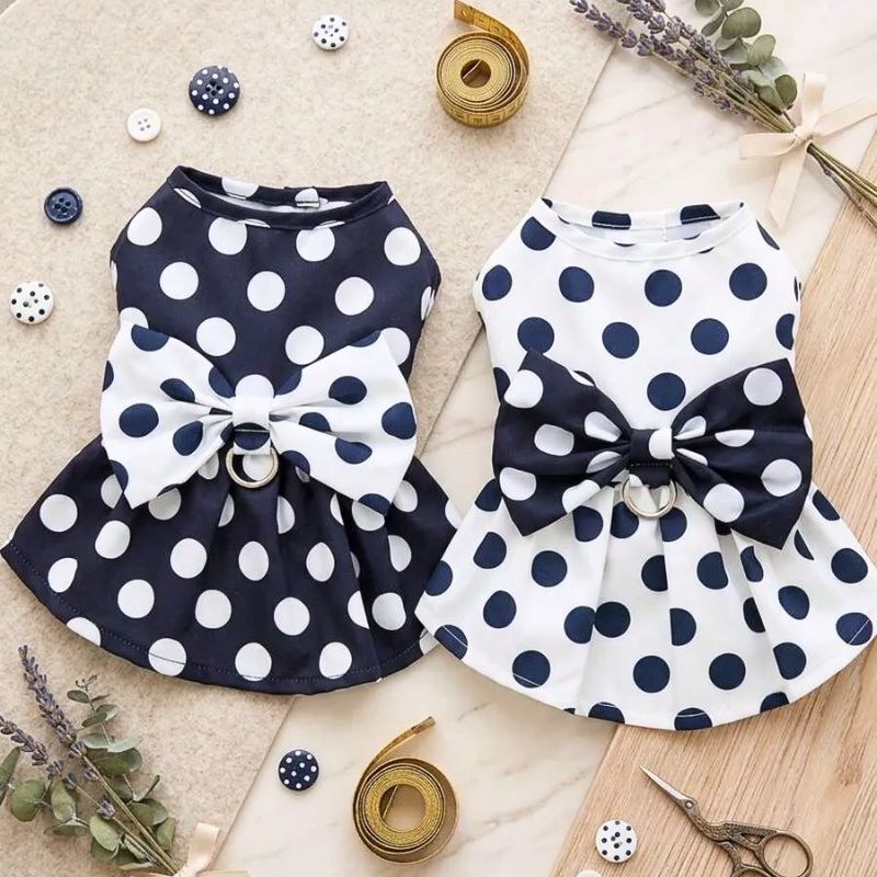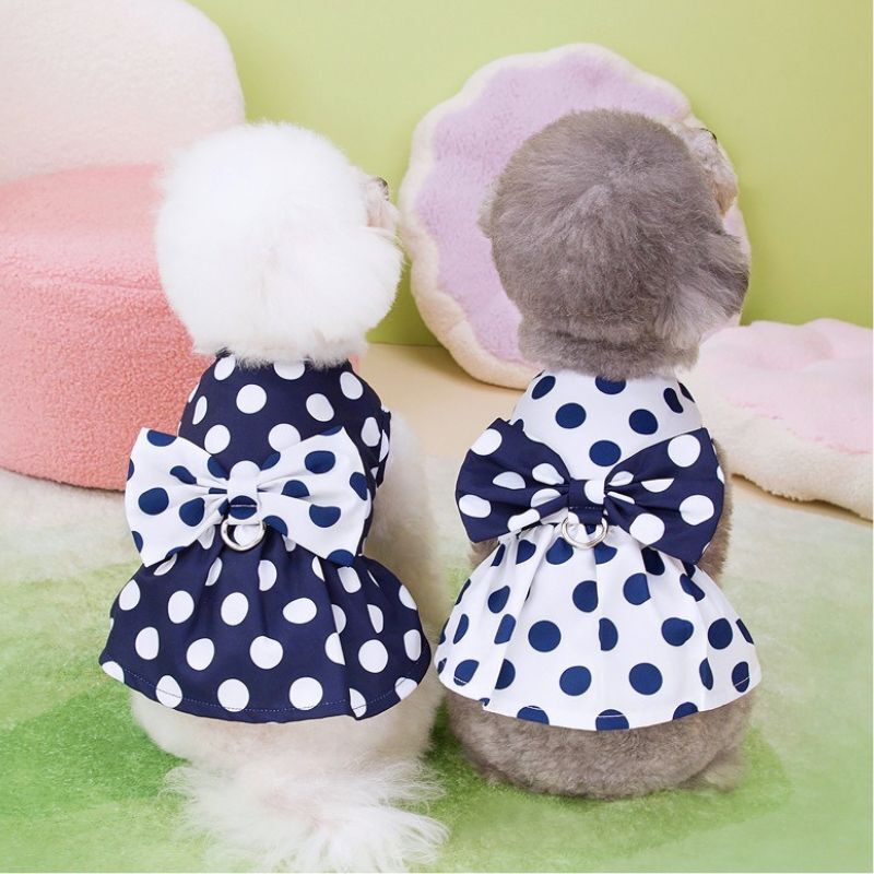 【予約】ドット柄リボンワンピース 犬服 春夏 おしゃれ Dカン付き 小型犬用